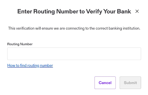 If the bank account connection is unsuccessful, you will be prompted to enter your routing number and to enter your bank account details manually.