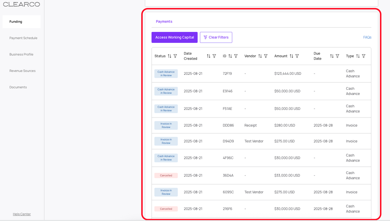 Clearco requires your business’ financial documents and information about your monthly payments to other capital providers. This helps us determine the amount of funding we can provide. Clearco requires these payment obligations to be updated monthly to help provide an up-to-date approved funding amount.