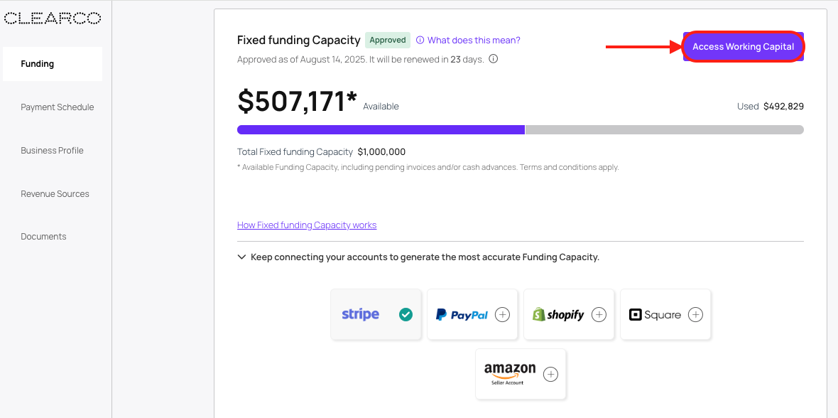 Once you have completed your business profile and connected revenue sources, your dashboard may show a preliminary capacity, with the option to access working capital.